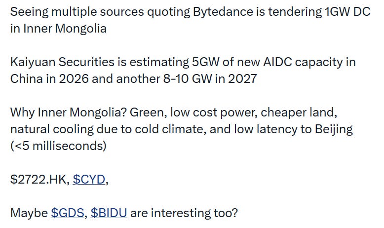 Today’s article provides a brief update on China’s AI Data Center (AIDC) buildout and a few interesting opportunities.